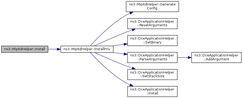Here is the call graph for this function:| ApplicationContainer ns3::Mip6dHelper::Install | ( | std::string | nodeName | ) |