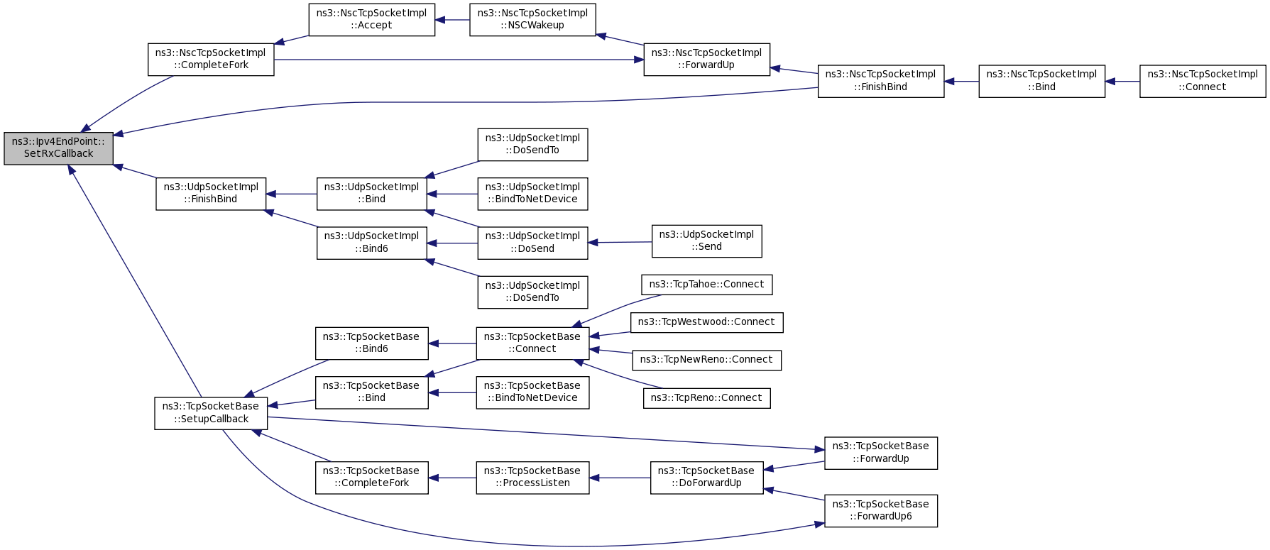 Here is the caller graph for this function:| void ns3::Ipv4EndPoint::SetRxCallback | ( | Callback< void, Ptr< Packet >, Ipv4Header, uint16_t, Ptr< Ipv4Interface > > | callback | ) |