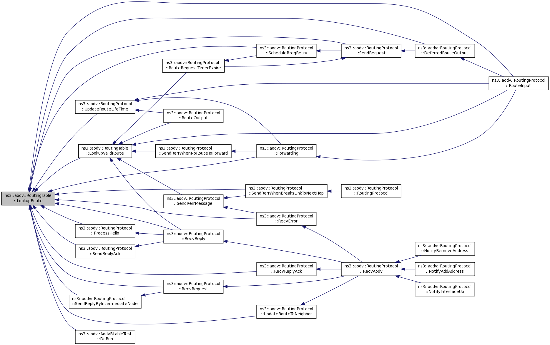 Referenced by ns3::aodv::RoutingProtocol::DeferredRouteOutput(), ns3::aodv::AodvRtableTest::DoRun(), ns3::aodv::RoutingProtocol::Forwarding(), LookupValidRoute(), ns3::aodv::RoutingProtocol::ProcessHello(), ns3::aodv::RoutingProtocol::RecvError(), ns3::aodv::RoutingProtocol::RecvReply(), ns3::aodv::RoutingProtocol::RecvReplyAck(), ns3::aodv::RoutingProtocol::RecvRequest(), ns3::aodv::RoutingProtocol::RouteInput(), ns3::aodv::RoutingProtocol::ScheduleRreqRetry(), ns3::aodv::RoutingProtocol::SendReplyAck(), ns3::aodv::RoutingProtocol::SendReplyByIntermediateNode(), ns3::aodv::RoutingProtocol::SendRequest(), ns3::aodv::RoutingProtocol::SendRerrWhenBreaksLinkToNextHop(), ns3::aodv::RoutingProtocol::UpdateRouteLifeTime(), and ns3::aodv::RoutingProtocol::UpdateRouteToNeighbor().