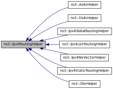 Implemented in ns3::Ipv4ListRoutingHelper, ns3::Ipv4StaticRoutingHelper, ns3::OlsrHelper, ns3::Ipv4NixVectorHelper, ns3::DsdvHelper, ns3::Ipv4GlobalRoutingHelper, and ns3::AodvHelper.