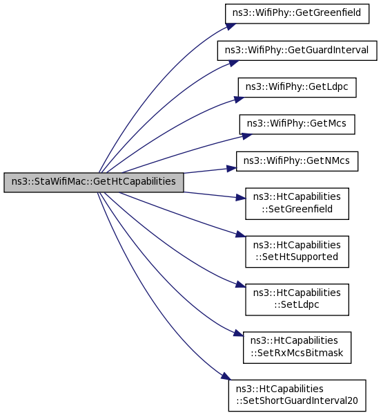 References ns3::WifiPhy::GetGreenfield(), ns3::WifiPhy::GetGuardInterval(), ns3::WifiPhy::GetLdpc(), ns3::WifiPhy::GetMcs(), ns3::WifiPhy::GetNMcs(), ns3::RegularWifiMac::m_phy, ns3::HtCapabilities::SetGreenfield(), ns3::HtCapabilities::SetHtSupported(), ns3::HtCapabilities::SetLdpc(), ns3::HtCapabilities::SetRxMcsBitmask(), and ns3::HtCapabilities::SetShortGuardInterval20().
