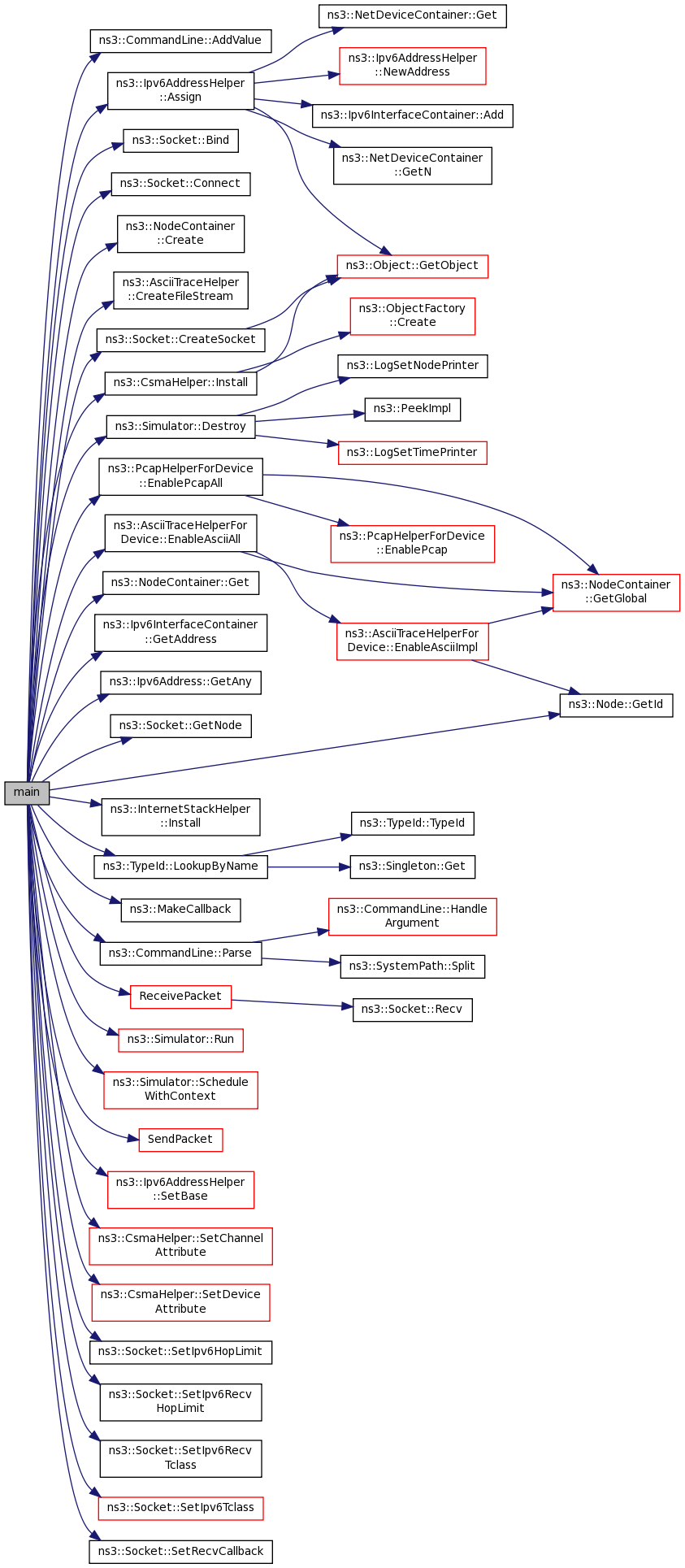 References ns3::CommandLine::AddValue(), ns3::Ipv6AddressHelper::Assign(), ns3::Socket::Bind(), ns3::Socket::Connect(), ns3::NodeContainer::Create(), ns3::AsciiTraceHelper::CreateFileStream(), ns3::Socket::CreateSocket(), ns3::Simulator::Destroy(), ns3::AsciiTraceHelperForDevice::EnableAsciiAll(), ns3::PcapHelperForDevice::EnablePcapAll(), ns3::NodeContainer::Get(), ns3::Ipv6InterfaceContainer::GetAddress(), ns3::Ipv6Address::GetAny(), ns3::Node::GetId(), ns3::Socket::GetNode(), ns3::CsmaHelper::Install(), ns3::InternetStackHelper::Install(), ns3::TypeId::LookupByName(), ns3::MakeCallback(), NS_LOG_INFO, ns3::CommandLine::Parse(), ReceivePacket(), ns3::Simulator::Run(), ns3::Simulator::ScheduleWithContext(), SendPacket(), ns3::Ipv6AddressHelper::SetBase(), ns3::CsmaHelper::SetChannelAttribute(), ns3::CsmaHelper::SetDeviceAttribute(), ns3::Socket::SetIpv6HopLimit(), ns3::Socket::SetIpv6RecvHopLimit(), ns3::Socket::SetIpv6RecvTclass(), ns3::Socket::SetIpv6Tclass(), and ns3::Socket::SetRecvCallback().