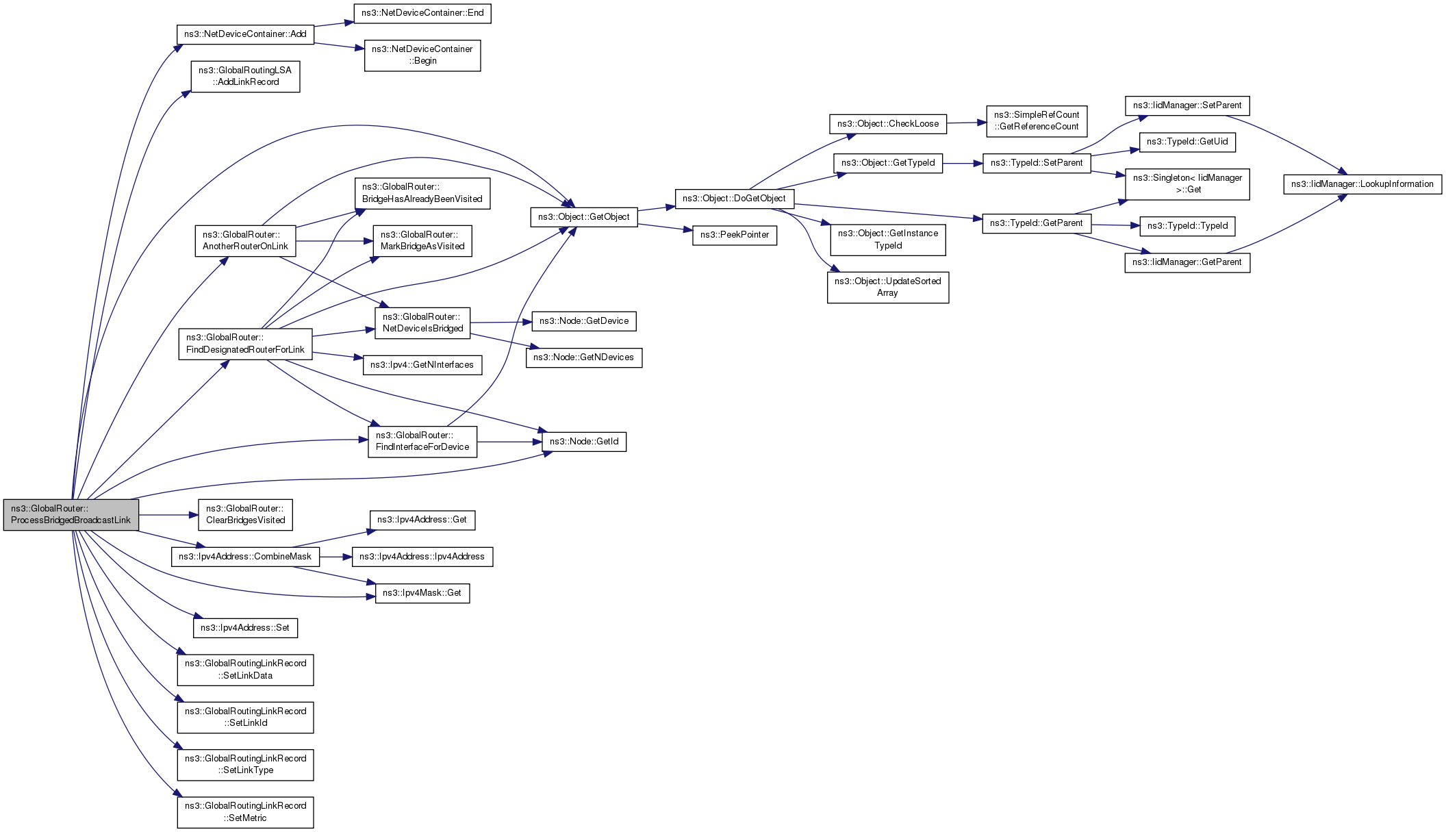 References ns3::NetDeviceContainer::Add(), ns3::GlobalRoutingLSA::AddLinkRecord(), AnotherRouterOnLink(), ClearBridgesVisited(), ns3::Ipv4Address::CombineMask(), FindDesignatedRouterForLink(), FindInterfaceForDevice(), ns3::Ipv4Mask::Get(), ns3::Node::GetId(), ns3::Object::GetObject(), NS_ABORT_MSG_IF, NS_ABORT_MSG_UNLESS, NS_LOG_FUNCTION, NS_LOG_LOGIC, NS_LOG_WARN, ns3::Ipv4Address::Set(), ns3::GlobalRoutingLinkRecord::SetLinkData(), ns3::GlobalRoutingLinkRecord::SetLinkId(), ns3::GlobalRoutingLinkRecord::SetLinkType(), ns3::GlobalRoutingLinkRecord::SetMetric(), ns3::GlobalRoutingLinkRecord::StubNetwork, and ns3::GlobalRoutingLinkRecord::TransitNetwork.