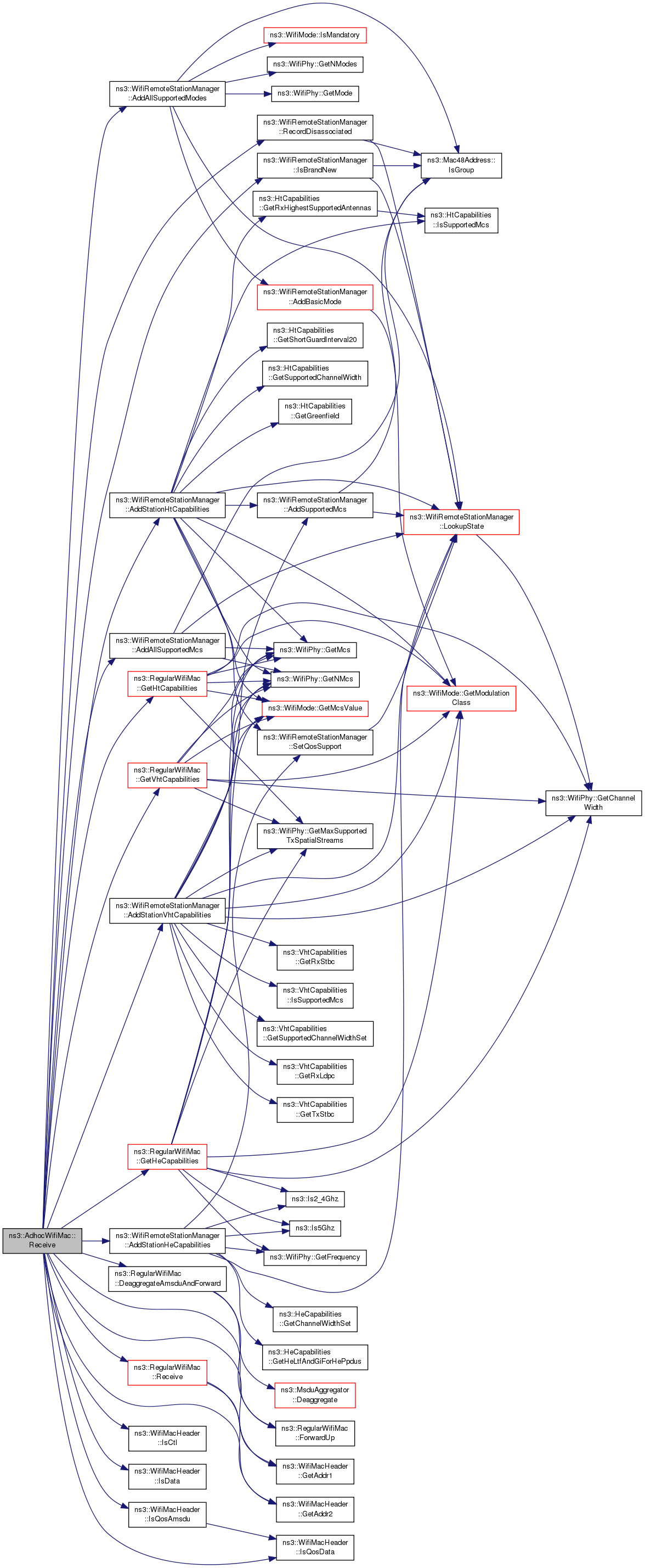 References ns3::WifiRemoteStationManager::AddAllSupportedMcs(), ns3::WifiRemoteStationManager::AddAllSupportedModes(), ns3::WifiRemoteStationManager::AddStationHeCapabilities(), ns3::WifiRemoteStationManager::AddStationHtCapabilities(), ns3::WifiRemoteStationManager::AddStationVhtCapabilities(), ns3::RegularWifiMac::DeaggregateAmsduAndForward(), ns3::RegularWifiMac::ForwardUp(), ns3::WifiMacHeader::GetAddr1(), ns3::WifiMacHeader::GetAddr2(), ns3::RegularWifiMac::GetHeCapabilities(), ns3::RegularWifiMac::GetHtCapabilities(), ns3::RegularWifiMac::GetVhtCapabilities(), ns3::WifiRemoteStationManager::IsBrandNew(), ns3::WifiMacHeader::IsCtl(), ns3::WifiMacHeader::IsData(), ns3::WifiMacHeader::IsQosAmsdu(), ns3::WifiMacHeader::IsQosData(), ns3::RegularWifiMac::m_heSupported, ns3::RegularWifiMac::m_htSupported, ns3::RegularWifiMac::m_stationManager, ns3::RegularWifiMac::m_vhtSupported, NS_ASSERT, NS_LOG_DEBUG, NS_LOG_FUNCTION, ns3::RegularWifiMac::Receive(), and ns3::WifiRemoteStationManager::RecordDisassociated().
