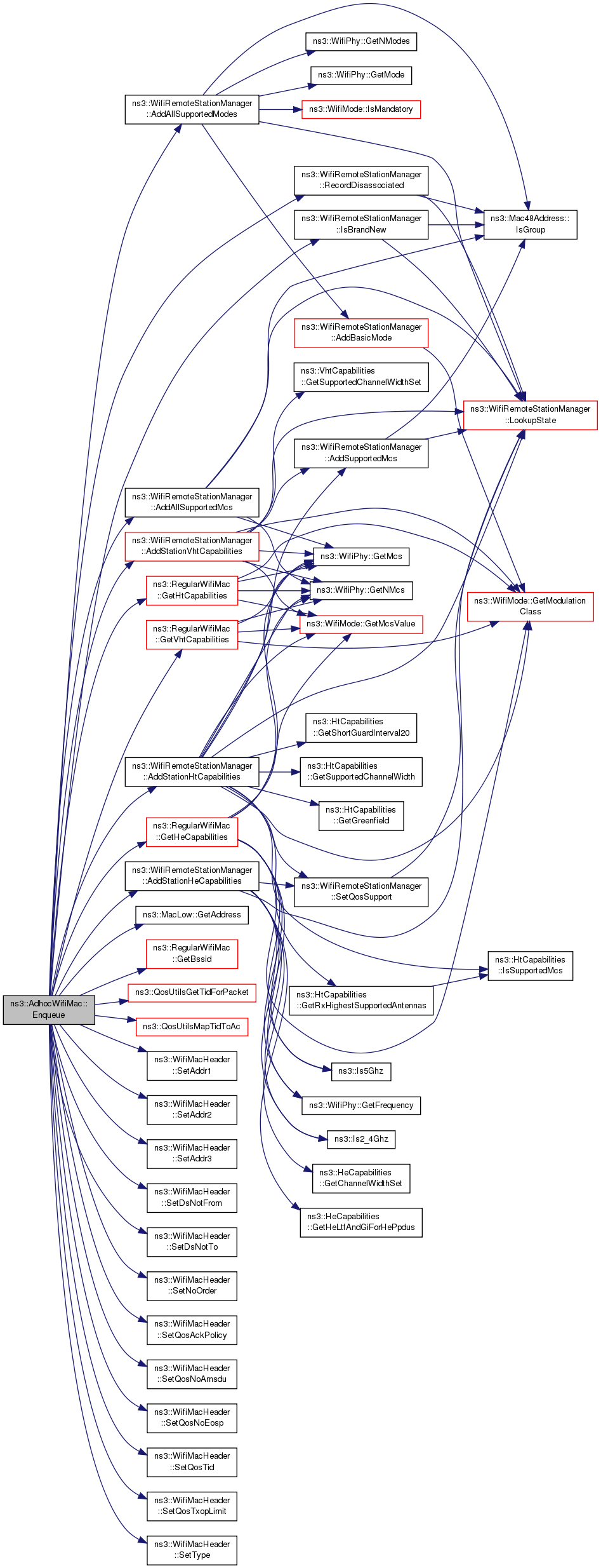 References ns3::WifiRemoteStationManager::AddAllSupportedMcs(), ns3::WifiRemoteStationManager::AddAllSupportedModes(), ns3::WifiRemoteStationManager::AddStationHeCapabilities(), ns3::WifiRemoteStationManager::AddStationHtCapabilities(), ns3::WifiRemoteStationManager::AddStationVhtCapabilities(), ns3::MacLow::GetAddress(), ns3::RegularWifiMac::GetBssid(), ns3::RegularWifiMac::GetHeCapabilities(), ns3::RegularWifiMac::GetHtCapabilities(), ns3::RegularWifiMac::GetVhtCapabilities(), ns3::WifiRemoteStationManager::IsBrandNew(), ns3::RegularWifiMac::m_dca, ns3::RegularWifiMac::m_edca, ns3::RegularWifiMac::m_heSupported, ns3::RegularWifiMac::m_htSupported, ns3::RegularWifiMac::m_low, ns3::RegularWifiMac::m_qosSupported, ns3::RegularWifiMac::m_stationManager, ns3::RegularWifiMac::m_vhtSupported, ns3::WifiMacHeader::NORMAL_ACK, NS_ASSERT, NS_LOG_FUNCTION, ns3::QosUtilsGetTidForPacket(), ns3::QosUtilsMapTidToAc(), ns3::WifiRemoteStationManager::RecordDisassociated(), ns3::WifiMacHeader::SetAddr1(), ns3::WifiMacHeader::SetAddr2(), ns3::WifiMacHeader::SetAddr3(), ns3::WifiMacHeader::SetDsNotFrom(), ns3::WifiMacHeader::SetDsNotTo(), ns3::WifiMacHeader::SetNoOrder(), ns3::WifiMacHeader::SetQosAckPolicy(), ns3::WifiMacHeader::SetQosNoAmsdu(), ns3::WifiMacHeader::SetQosNoEosp(), ns3::WifiMacHeader::SetQosTid(), ns3::WifiMacHeader::SetQosTxopLimit(), ns3::WifiMacHeader::SetType(), ns3::WIFI_MAC_DATA, and ns3::WIFI_MAC_QOSDATA.