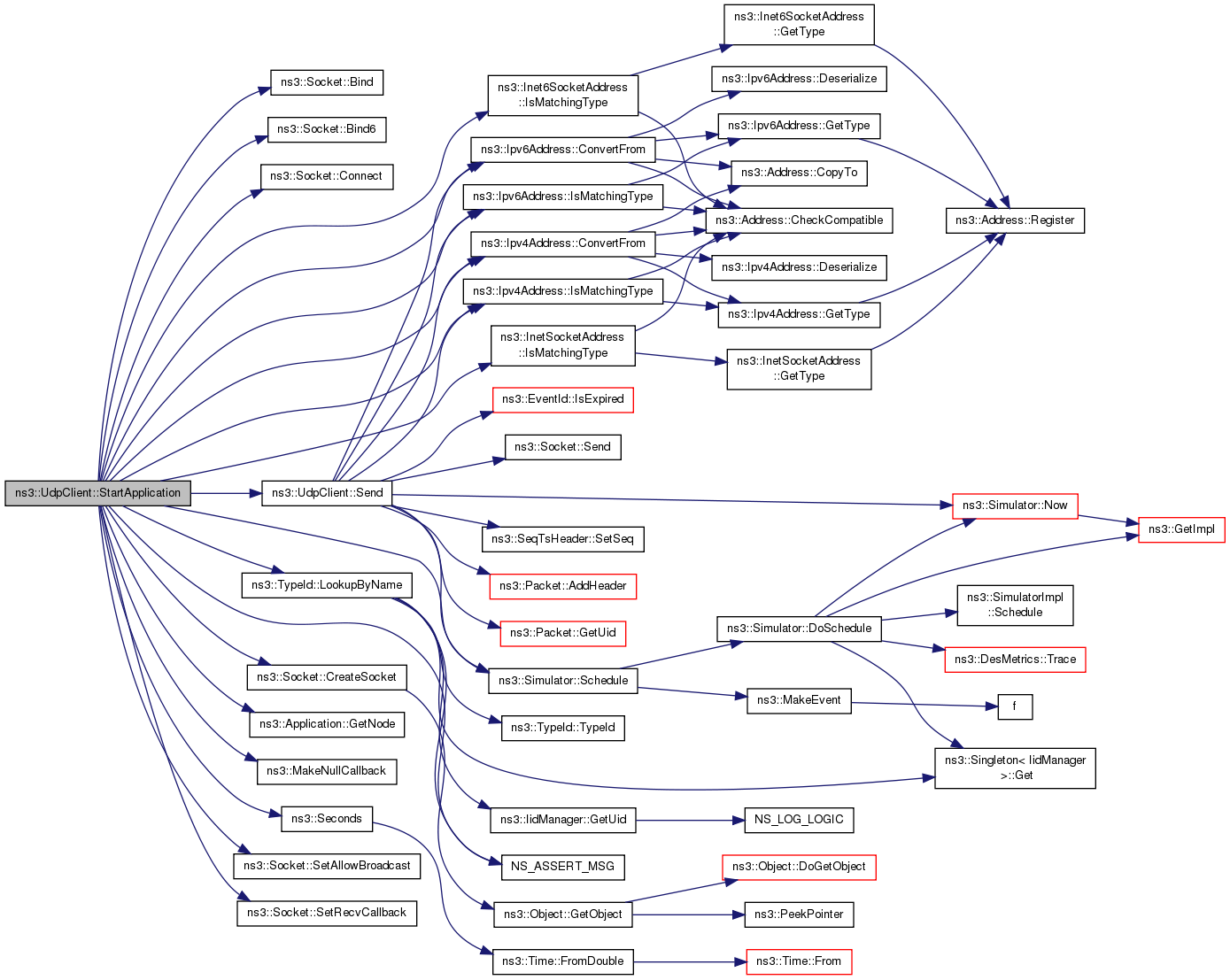 References ns3::Socket::Bind(), ns3::Socket::Bind6(), ns3::Socket::Connect(), ns3::Ipv4Address::ConvertFrom(), ns3::Ipv6Address::ConvertFrom(), ns3::Socket::CreateSocket(), ns3::Application::GetNode(), ns3::Inet6SocketAddress::IsMatchingType(), ns3::InetSocketAddress::IsMatchingType(), ns3::Ipv4Address::IsMatchingType(), ns3::Ipv6Address::IsMatchingType(), ns3::TypeId::LookupByName(), m_peerAddress, m_peerPort, m_sendEvent, m_socket, ns3::MakeNullCallback(), NS_ASSERT_MSG(), NS_FATAL_ERROR, NS_LOG_FUNCTION, ns3::Simulator::Schedule(), ns3::Seconds(), Send(), ns3::Socket::SetAllowBroadcast(), and ns3::Socket::SetRecvCallback().