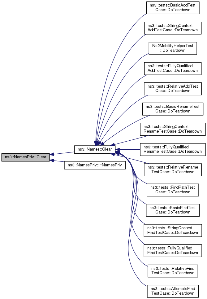 Here is the call graph for this function:| void ns3::NamesPriv::Clear | ( | void | ) |