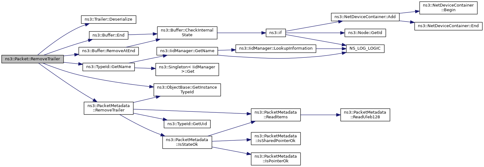 Here is the call graph for this function:| uint32_t ns3::Packet::RemoveTrailer | ( | Trailer & | trailer | ) |