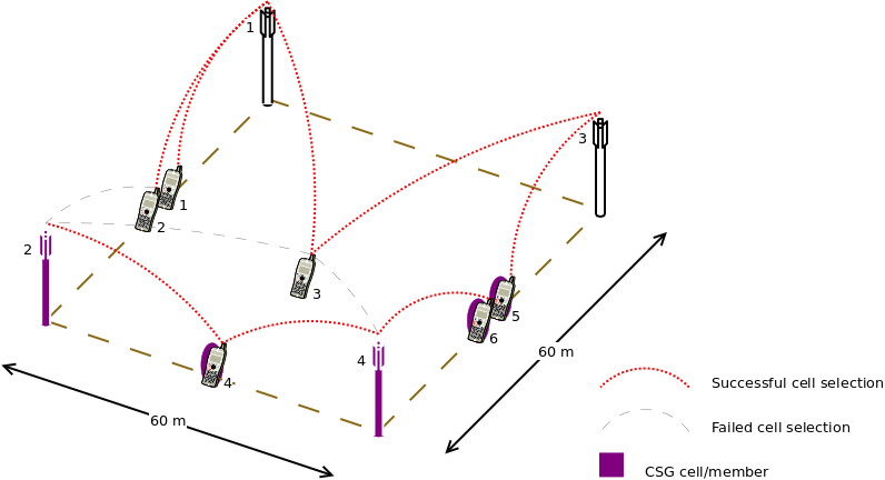 The figure shows that CSG members may attach to either CSG or non-CSG cells, and simply choose the stronger one. On the other hand, non-members can only attach to non-CSG cells, even when they are actually receiving stronger signal from a CSG cell.