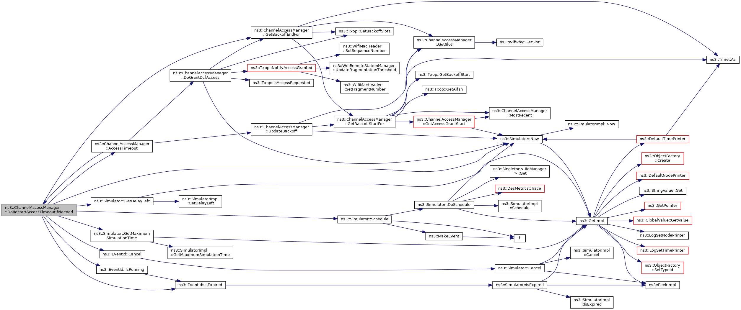 References DoGrantDcfAccess(), DoGrantPcfAccess(), DoRestartAccessTimeoutIfNeeded(), GetAccessGrantStart(), ns3::Txop::GetAifsn(), ns3::Txop::GetBackoffStart(), GetSlot(), ns3::Txop::IsAccessRequested(), ns3::Txop::IsQosTxop(), m_accessTimeout, m_off, m_phy, m_sleeping, MostRecent(), ns3::Txop::NotifyAccessRequested(), ns3::WifiPhy::NotifyChannelAccessRequested(), ns3::Simulator::Now(), NS_ASSERT, NS_LOG_FUNCTION, ns3::Simulator::Schedule(), UpdateBackoff(), and ns3::Txop::UpdateBackoffSlotsNow().
