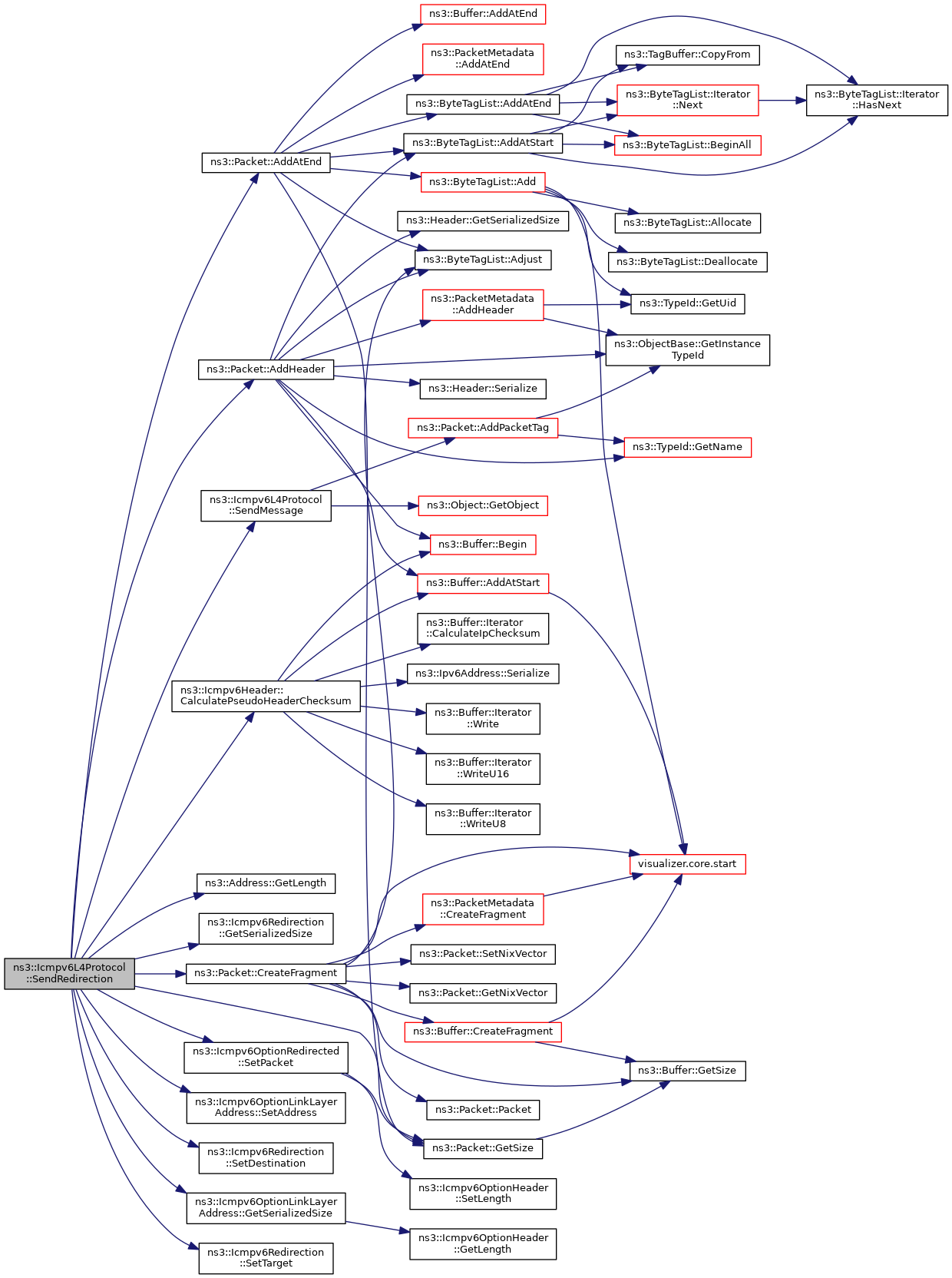 References ns3::Packet::AddAtEnd(), ns3::Packet::AddHeader(), ns3::Icmpv6Header::CalculatePseudoHeaderChecksum(), ns3::Packet::CreateFragment(), ns3::Address::GetLength(), ns3::Icmpv6Redirection::GetSerializedSize(), ns3::Icmpv6OptionLinkLayerAddress::GetSerializedSize(), ns3::Packet::GetSize(), NS_LOG_FUNCTION, NS_LOG_LOGIC, PROT_NUMBER, SendMessage(), ns3::Icmpv6OptionLinkLayerAddress::SetAddress(), ns3::Icmpv6Redirection::SetDestination(), ns3::Icmpv6OptionRedirected::SetPacket(), and ns3::Icmpv6Redirection::SetTarget().