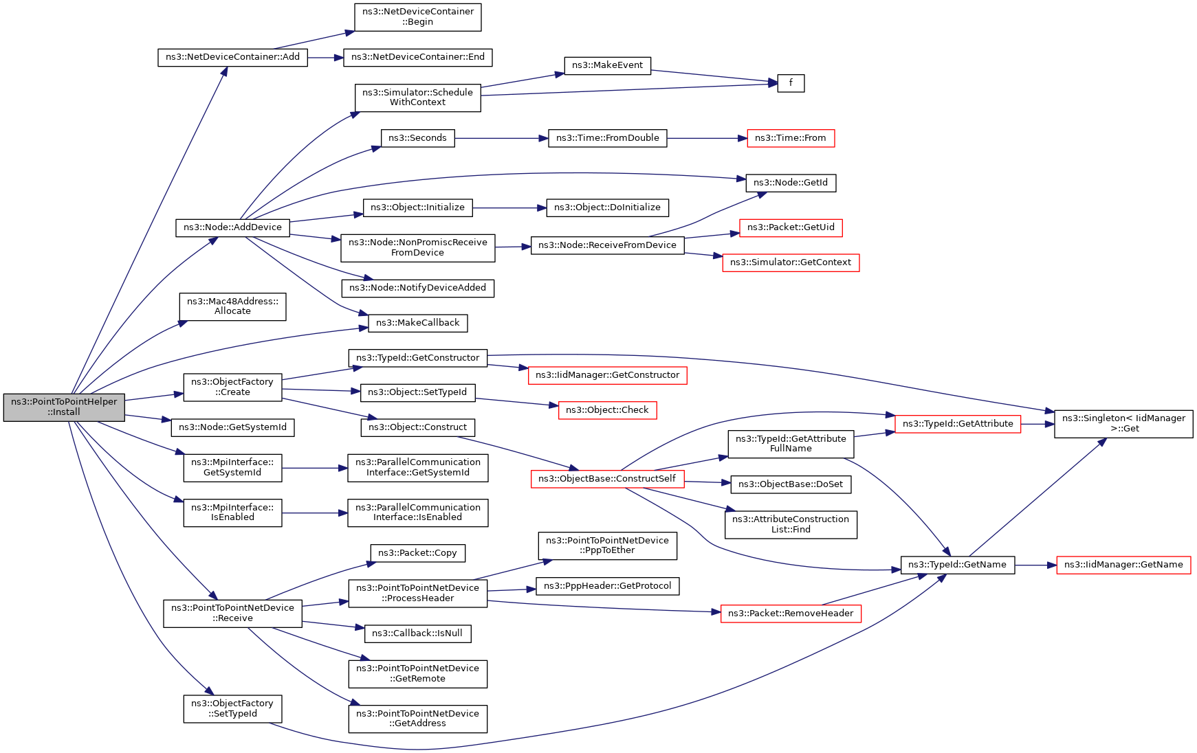 This method creates a ns3::PointToPointChannel with the attributes configured by PointToPointHelper::SetChannelAttribute, then, for each node in the input container, we create a ns3::PointToPointNetDevice with the requested attributes, a queue for this ns3::NetDevice, and associate the resulting ns3::NetDevice with the ns3::Node and ns3::PointToPointChannel.