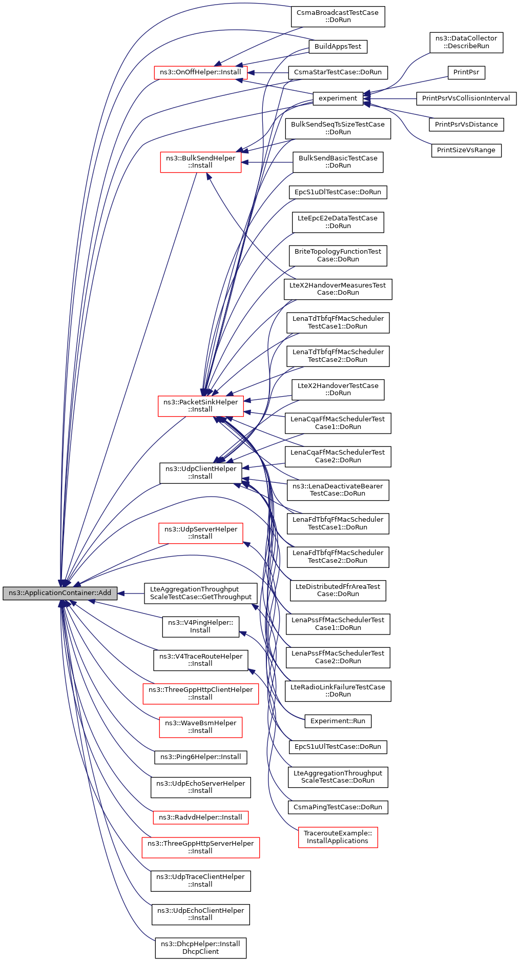 Referenced by Experiment::ApplicationSetup(), BuildAppsTest(), CreateBulkFlow(), CreateOnOffFlow(), WifiMsduAggregatorThroughputTest::DoRun(), Ns3TcpNoDelayTestCase::DoRun(), RadvdTestCase::DoRun(), Ns3TcpSocketTestCase1::DoRun(), BulkSendBasicTestCase::DoRun(), NscTcpLossTestCase1::DoRun(), UdpClientServerTestCase::DoRun(), DhcpTestCase::DoRun(), WifiAcMappingTest::DoRun(), CsmaBridgeTestCase::DoRun(), Issue211Test::DoRun(), Ns3TcpLossTestCase::DoRun(), Ns3TcpStateTestCase::DoRun(), BriteTopologyFunctionTestCase::DoRun(), Ns3TcpInteroperabilityTestCase::DoRun(), LteIpv6RoutingTestCase::DoRun(), EpcS1uDlTestCase::DoRun(), UdpTraceClientServerTestCase::DoRun(), BulkSendSeqTsSizeTestCase::DoRun(), Ns3TcpSocketTestCase2::DoRun(), CsmaBroadcastTestCase::DoRun(), NscTcpLossTestCase2::DoRun(), Ns3TcpCwndTestCase1::DoRun(), CsmaMulticastTestCase::DoRun(), EpcS1uUlTestCase::DoRun(), Ns3TcpCwndTestCase2::DoRun(), CsmaOneSubnetTestCase::DoRun(), CsmaPacketSocketTestCase::DoRun(), CsmaPingTestCase::DoRun(), CsmaRawIpSocketTestCase::DoRun(), CsmaStarTestCase::DoRun(), experiment(), ns3::WaveBsmHelper::Install(), TracerouteExample::InstallApplications(), AodvExample::InstallApplications(), DsdvManetExample::InstallApplications(), InstallBulkSend(), InstallPacketSink(), NetAnimExperiment::Run(), Experiment::Run(), and RoutingHelper::SetupRoutingMessages().