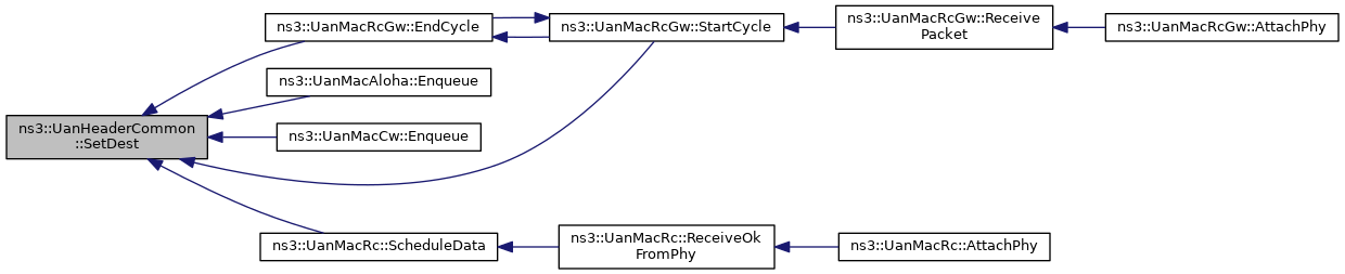 Here is the call graph for this function:| void ns3::UanHeaderCommon::SetDest | ( | Mac8Address | dest | ) |