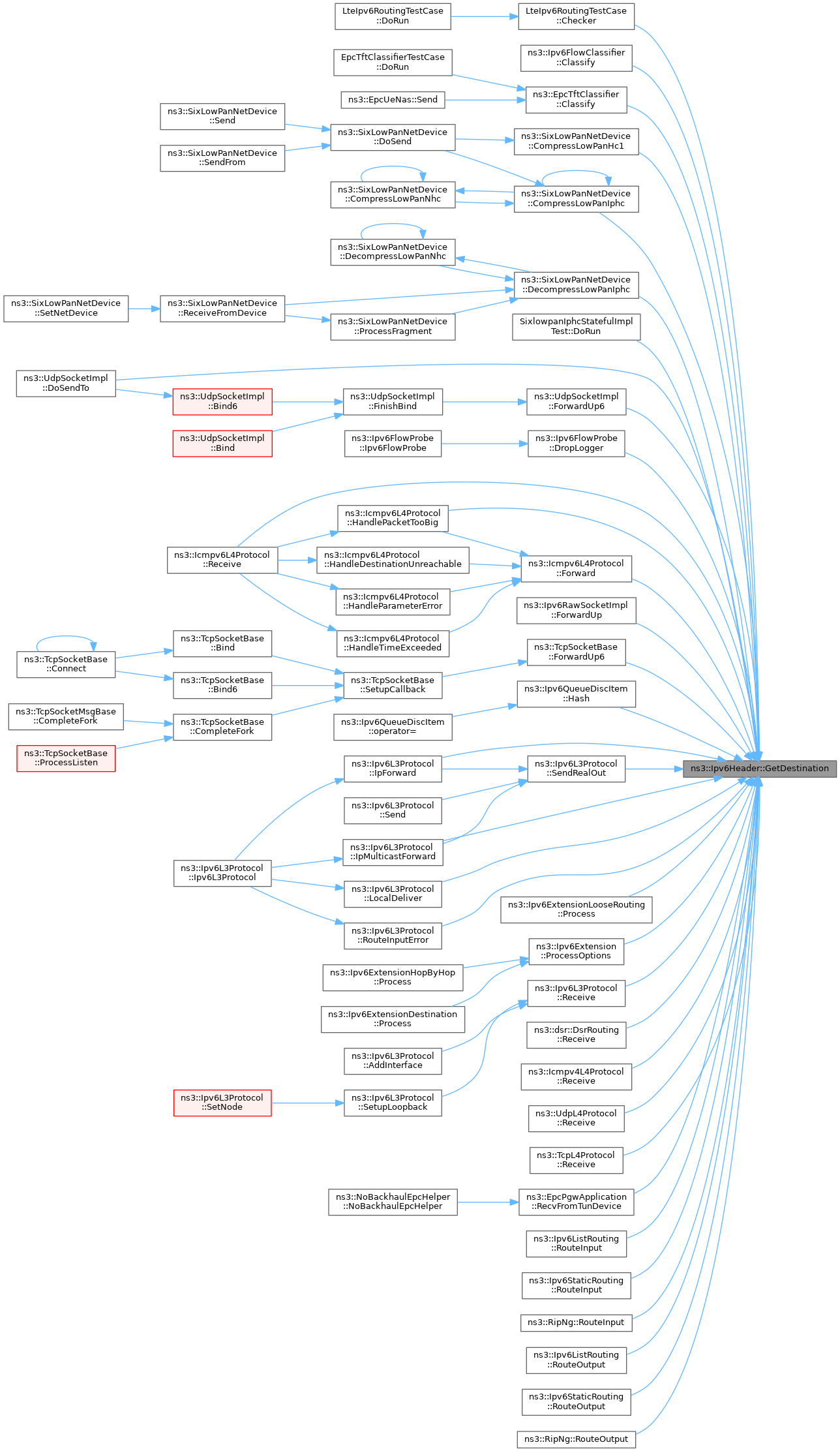 Referenced by ns3::Ipv6FlowClassifier::Classify(), ns3::EpcTftClassifier::Classify(), ns3::SixLowPanNetDevice::CompressLowPanHc1(), ns3::SixLowPanNetDevice::CompressLowPanIphc(), LteIpv6RoutingTestCase::EnbToPgw(), ns3::Icmpv6L4Protocol::Forward(), ns3::Ipv6RawSocketImpl::ForwardUp(), ns3::Ipv6ExtensionFragment::GetFragments(), ns3::Ipv6QueueDiscItem::Hash(), ns3::Ipv6L3Protocol::LocalDeliver(), ns3::Ipv6L3Protocol::Receive(), LteIpv6RoutingTestCase::ReceivedAtClient(), IcmpV6EchoReplyTestCase::ReceivePkt(), IcmpV6TimeExceedTestCase::ReceivePkt(), LteIpv6RoutingTestCase::SentAtClient(), and LteIpv6RoutingTestCase::TunToPgw().