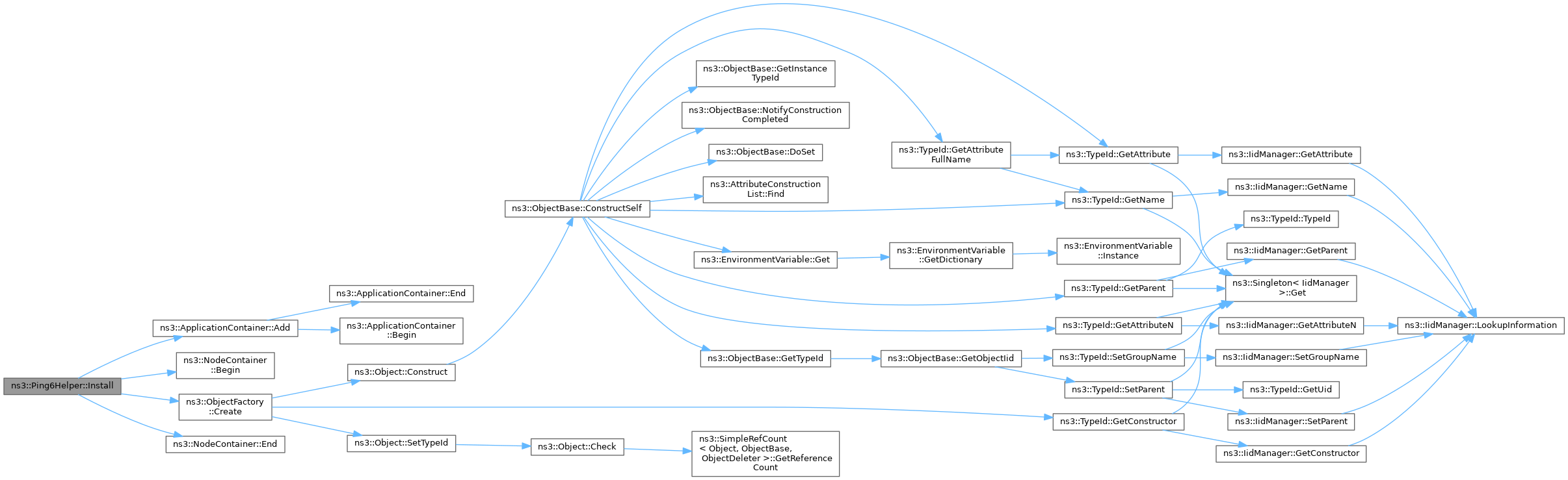 Here is the call graph for this function:| ApplicationContainer ns3::Ping6Helper::Install | ( | NodeContainer | c | ) |