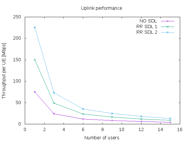 uplink_results using 1:($2==2 ? $3/1000000 : 1/0) w lp t ‘RR SDL 1’, uplink_results using 1:($2==3 ? $3/1000000 : 1/0) w lp t ‘RR SDL 2’