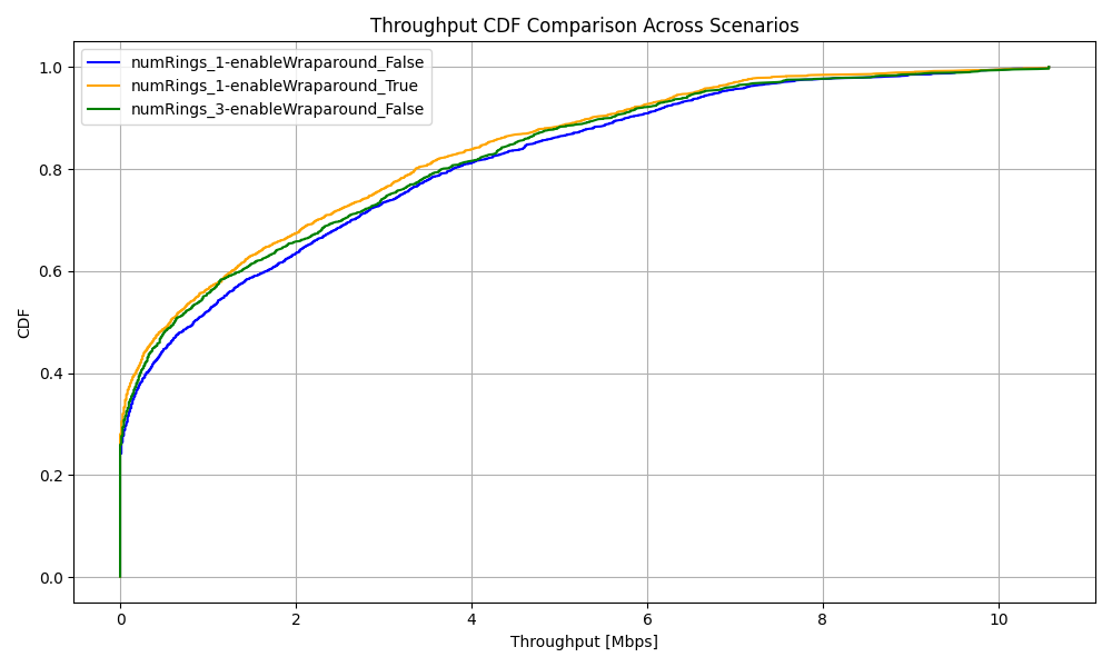 Interference with ring 1 and wraparound (orange) is higher than even ring 3 (green). This, in spite of only simulating 7 tri-cell clusters of ring 1 versus the 19 clusters of ring 3. The interference of both ring 1 with wraparound and ring 3 have much much higher than ring 1 without wraparound (blue). As a result, throughput without wraparound is unrealistically high (indicated by lower curves shifted to the right). This is confirmed in the following right figure.