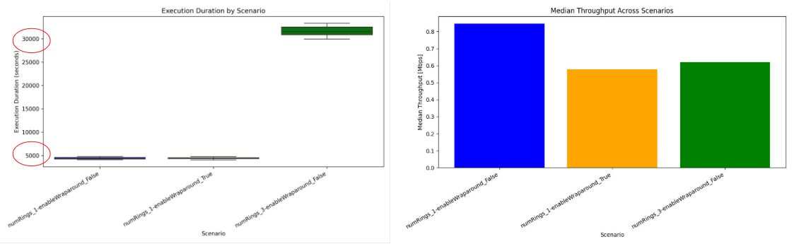 Left: Execution times of ring 1 setup with and without wraparound, plus ring 3 setup without wraparound in an AMD Ryzen Threadripper PRO 7965WX. Right: Median throughput of the different configurations.¶
