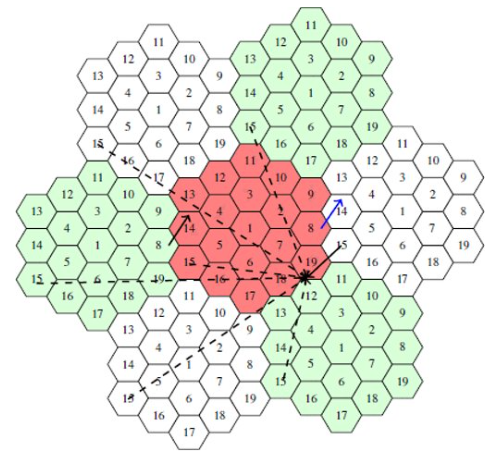 Virtual cell clusters (white and green) around real cell cluster (red). Virtual distances are shown as dashed arrows. The virtual transmitter position that results in the smallest distance to receiver is used in the virtual mobility model. [Panwar]¶
