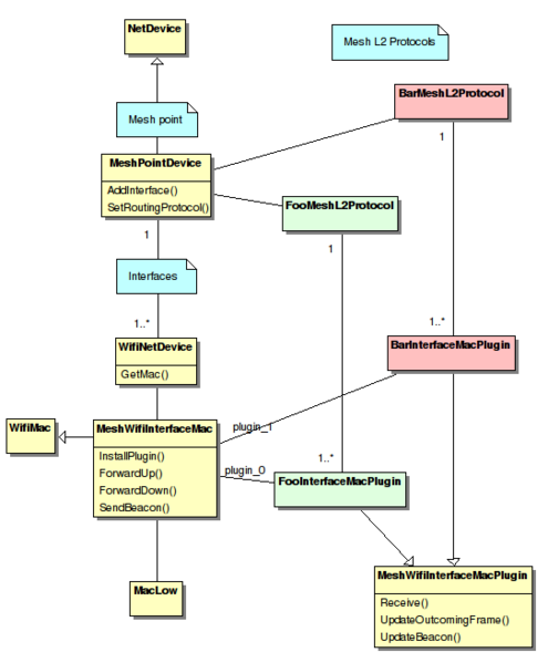 The main part of MAC-layer routing model is specific type of a network device -- ns3::MeshPointDevice. Being an interface to upper-layer protocols, it provides routing functionality hidden from upper-layer protocols, by means of ns3::MeshL2RoutingProtocol.
